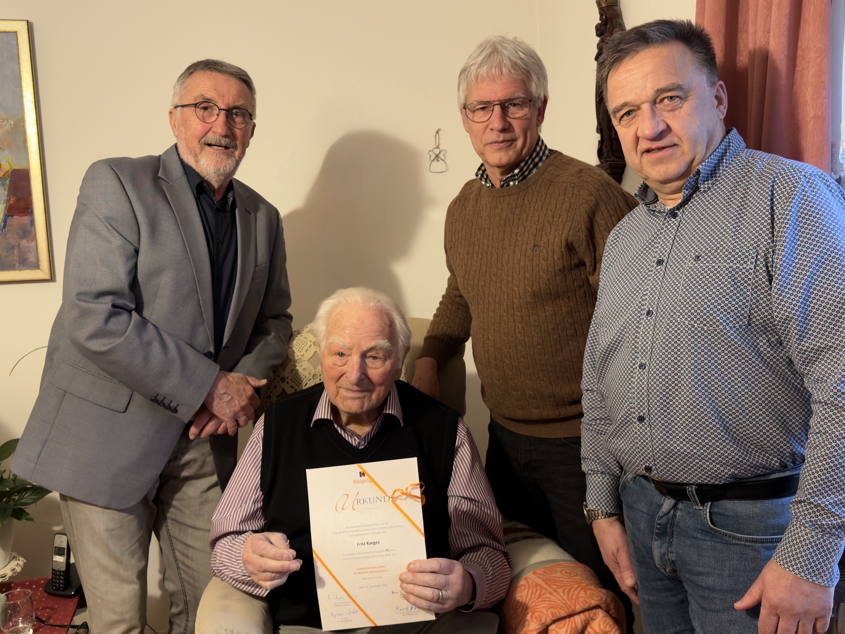 Die Hünfelder Kolpingsfamilie überreichte Anfang des Jahres eine seltene Urkunde: Fritz Karges, am 24.01.1930 geboren, wurde für seine 75jährige Mitgliedschaft geehrt, die am 03.12.1950 begann. Bereits drei Jahre nach seinem Eintritt in die Kolpingsfamilie wurde er zum Senior gewählt und war danach noch viele Jahre im Vorstand aktiv.