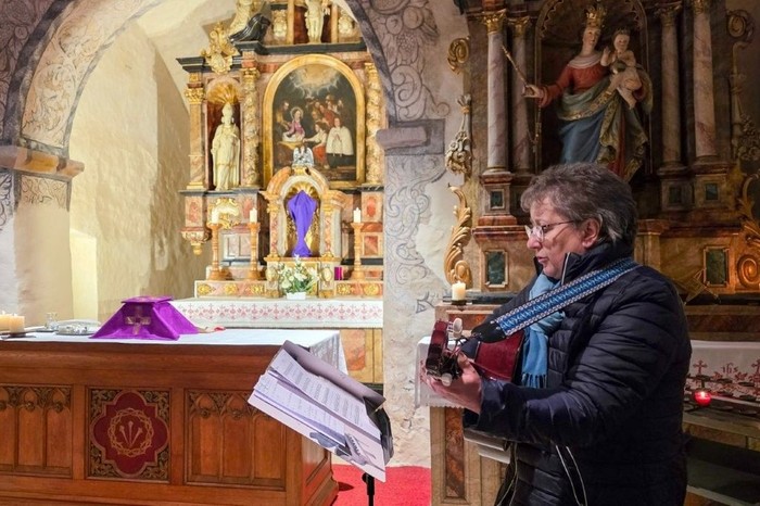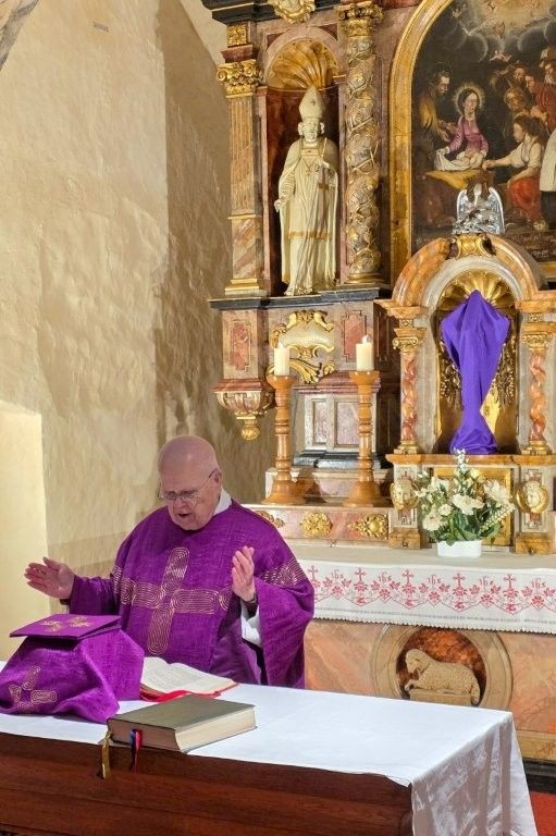 Nach dem Kreuzweg feierte Bezirkspräses Pfarrer Ulrich Trzeciok (Naumburg) in der Kapelle den gemeinsamen Gottesdienst. Frau Ulrike Bachmann begleitete den Gesang einfühlsam auf der Gitarre. Im Anschluss erläuterte Wolfgang Josef, Vorsitzender des Fördervereins St. Brigida in Ungedanken e.V., interessante historische Hintergründe zur Burg und zur Kapelle. Die Teilnehmer dankten mit einer Spende am Kapellenausgang.