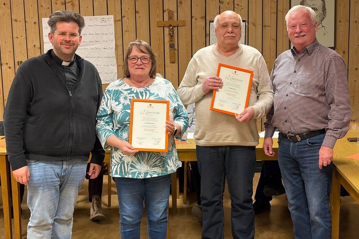 Für ihre 25‑jährige Mitgliedschaft wurden Erhard und Elisabeth Gorek geehrt. Präses und Vorsitzender überreichten die Urkunden sowie die silbernen Ehrennadeln des Kolpingwerkes.